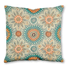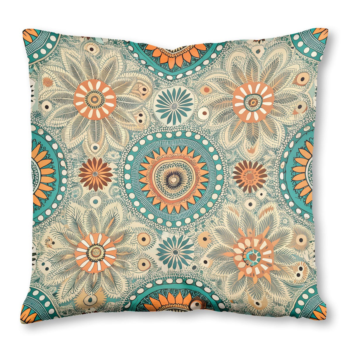 This is a vibrant, repeating pattern featuring intricate mandalas and stylized flowers in a bohemian, folk-art style. The design uses a striking color palette of teal, orange, and cream, with detailed line work and dotted textures creating a rich, layered effect.