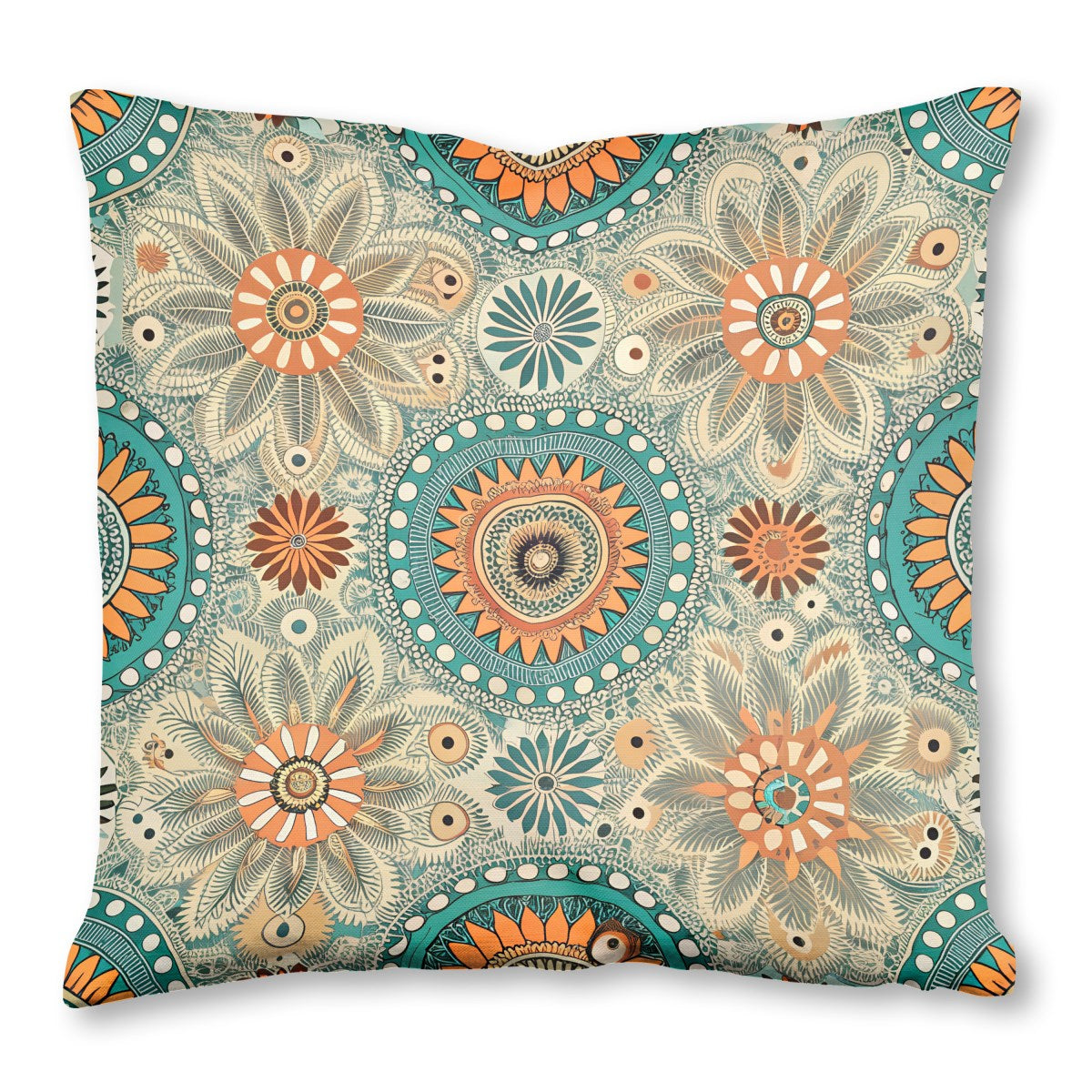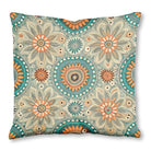 This is a vibrant, repeating pattern featuring intricate mandalas and stylized flowers in a bohemian, folk-art style. The design uses a striking color palette of teal, orange, and cream, with detailed line work and dotted textures creating a rich, layered effect.