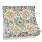 This is a vibrant, repeating pattern featuring intricate mandalas and stylized flowers in a bohemian, folk-art style. The design uses a striking color palette of teal, orange, and cream, with detailed line work and dotted textures creating a rich, layered effect.