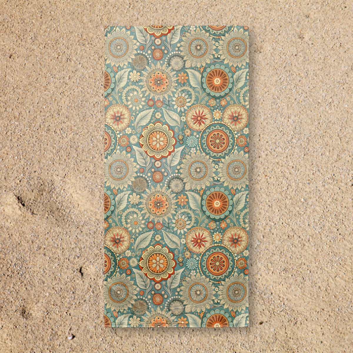 A vibrant, bohemian-style floral pattern featuring intricate, mandala-like flowers and stylized leaves. The rich color palette of teal, orange, and cream creates a warm, retro aesthetic on a dense, folk-art-inspired background.