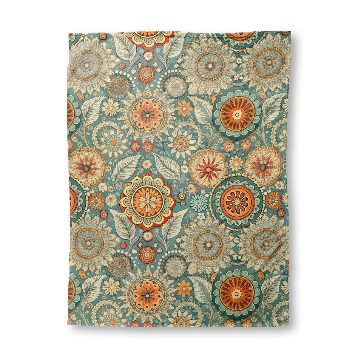 A vibrant, bohemian-style floral pattern featuring intricate, mandala-like flowers and stylized leaves. The rich color palette of teal, orange, and cream creates a warm, retro aesthetic on a dense, folk-art-inspired background.