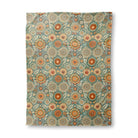 A vibrant, bohemian-style floral pattern featuring intricate, mandala-like flowers and stylized leaves. The rich color palette of teal, orange, and cream creates a warm, retro aesthetic on a dense, folk-art-inspired background.