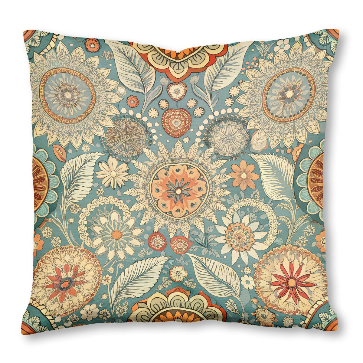 A vibrant, bohemian-style floral pattern featuring intricate, mandala-like flowers and stylized leaves. The rich color palette of teal, orange, and cream creates a warm, retro aesthetic on a dense, folk-art-inspired background.