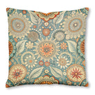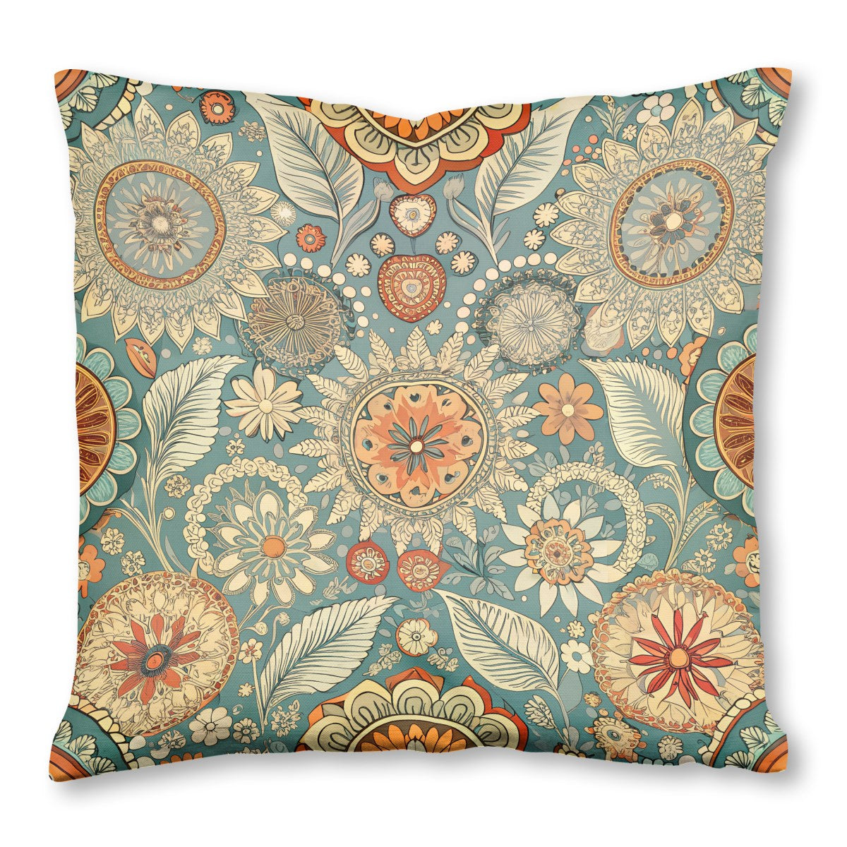 A vibrant, bohemian-style floral pattern featuring intricate, mandala-like flowers and stylized leaves. The rich color palette of teal, orange, and cream creates a warm, retro aesthetic on a dense, folk-art-inspired background.