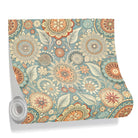 A vibrant, bohemian-style floral pattern featuring intricate, mandala-like flowers and stylized leaves. The rich color palette of teal, orange, and cream creates a warm, retro aesthetic on a dense, folk-art-inspired background.