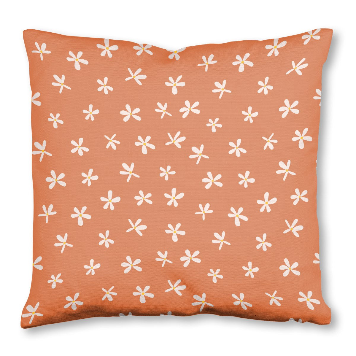 A seamless floral pattern featuring small, simple white flowers with yellow centers. The stylized blossoms are scattered across a warm, terracotta-colored background, creating a charming and minimalist design with a hand-drawn feel.