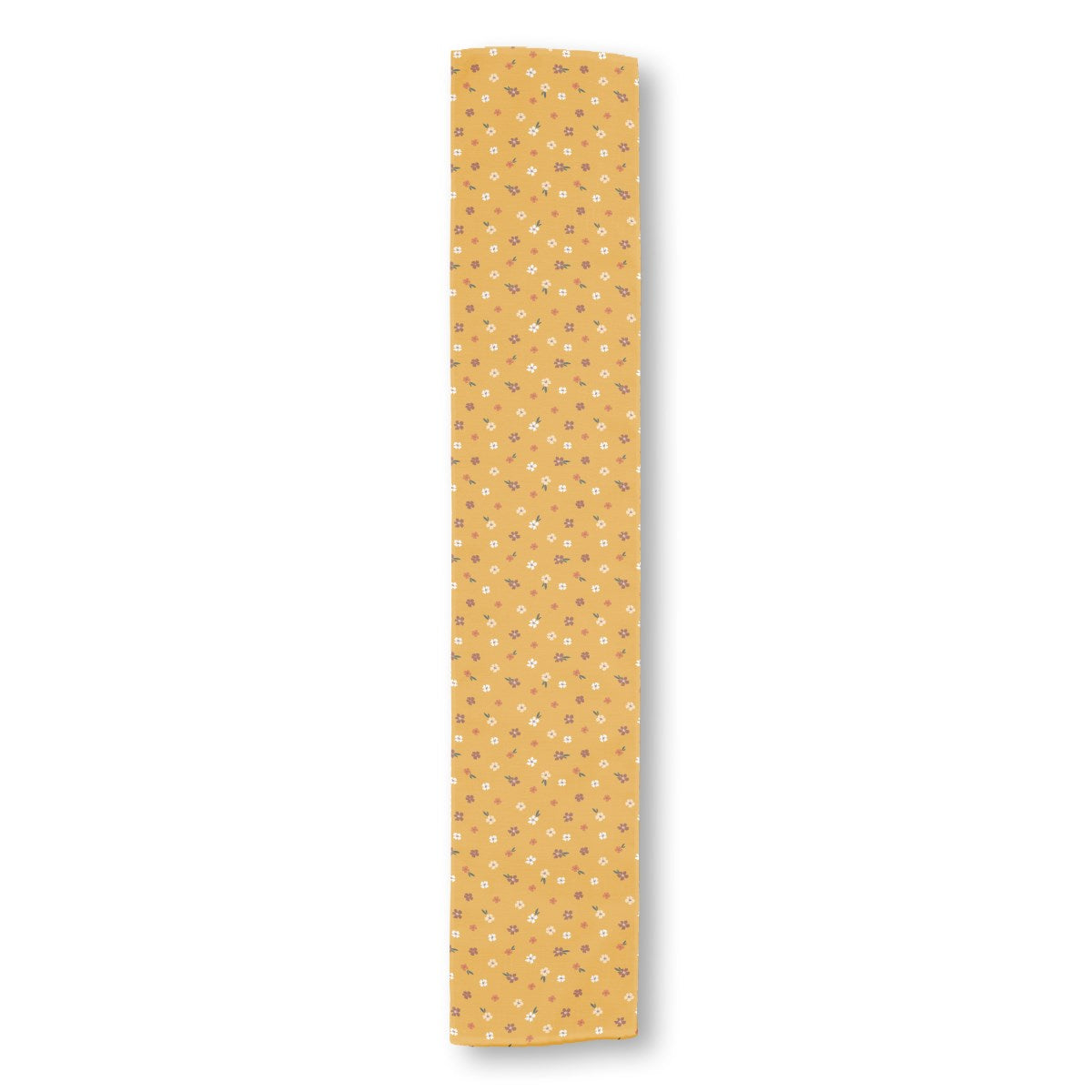 This is a seamless floral pattern featuring small, stylized flowers in white, brown, and rust-orange scattered across a solid mustard-yellow background. Some flowers have tiny green leaves, creating a warm, rustic design.