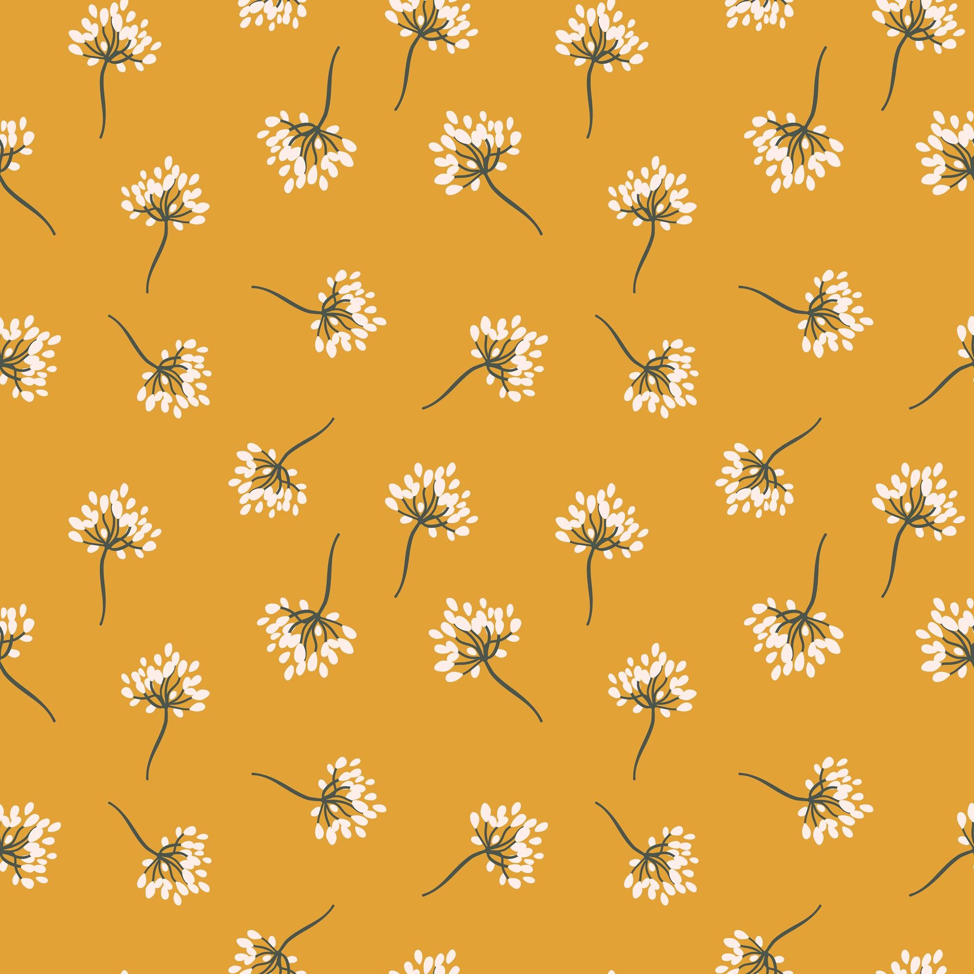 A repeating pattern of stylized white flowers with dark stems scattered across a solid mustard-yellow background. The simple, whimsical floral design has a modern, graphic feel, creating a cheerful and charming aesthetic.