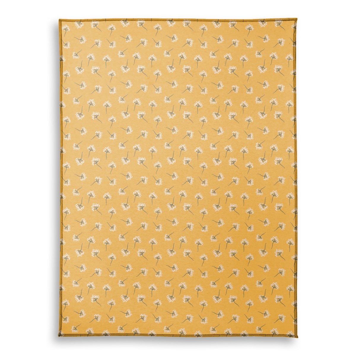 A repeating pattern of stylized white flowers with dark stems scattered across a solid mustard-yellow background. The simple, whimsical floral design has a modern, graphic feel, creating a cheerful and charming aesthetic.