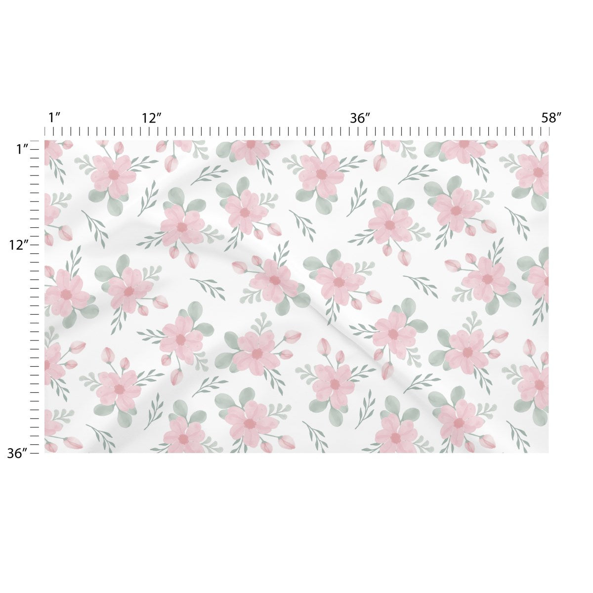 A seamless watercolor pattern featuring delicate pink flowers, buds, and sage green leaves. The gentle floral elements are scattered across a clean white background, creating a soft, elegant, and charming design suitable for textiles or wallpaper.