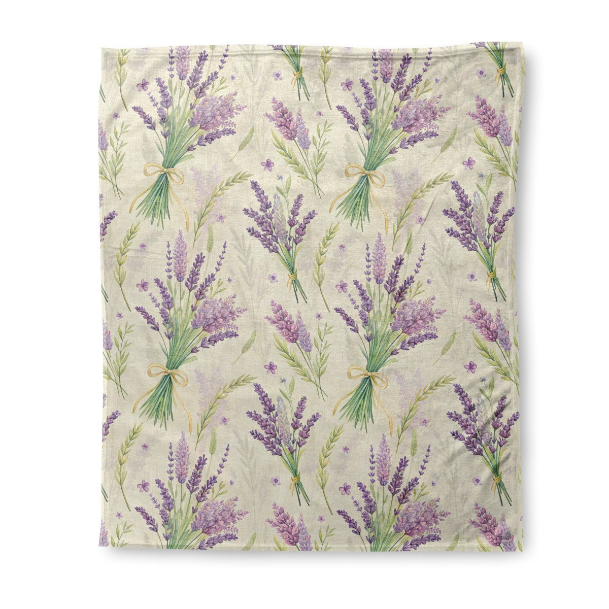 This is a watercolor-style botanical pattern of purple lavender. Bouquets and loose sprigs are scattered across a textured, light beige background. A prominent bunch tied with a yellow ribbon creates a central focus in this charming, rustic design.