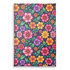 A vibrant, seamless pattern of stylized folk-art flowers. The bold, colorful blossoms in shades of pink, orange, and purple, along with green leaves, stand out against a dark navy background, creating a dense and cheerful composition.