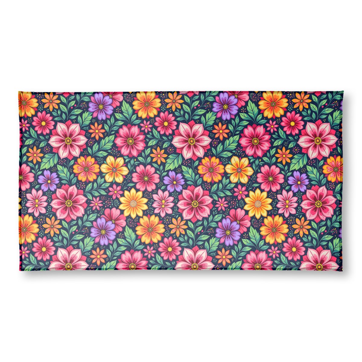 A vibrant, seamless pattern of stylized folk-art flowers. The bold, colorful blossoms in shades of pink, orange, and purple, along with green leaves, stand out against a dark navy background, creating a dense and cheerful composition.