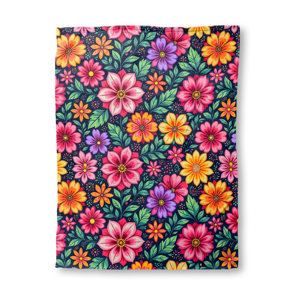 A vibrant, seamless pattern of stylized folk-art flowers. The bold, colorful blossoms in shades of pink, orange, and purple, along with green leaves, stand out against a dark navy background, creating a dense and cheerful composition.