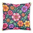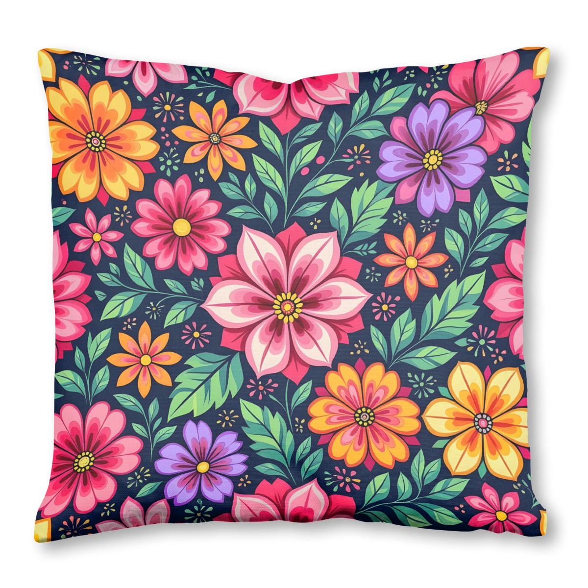 A vibrant, seamless pattern of stylized folk-art flowers. The bold, colorful blossoms in shades of pink, orange, and purple, along with green leaves, stand out against a dark navy background, creating a dense and cheerful composition.