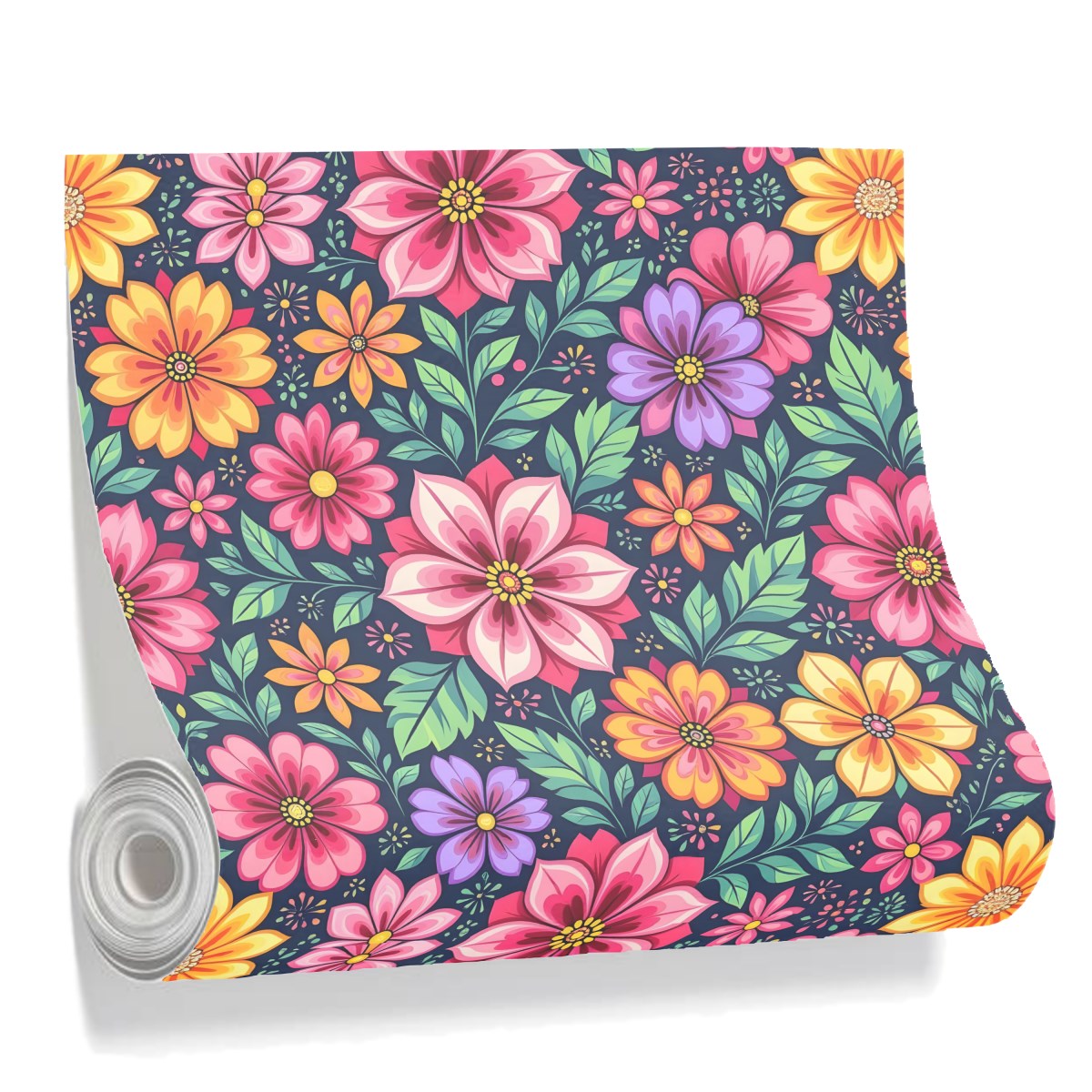 A vibrant, seamless pattern of stylized folk-art flowers. The bold, colorful blossoms in shades of pink, orange, and purple, along with green leaves, stand out against a dark navy background, creating a dense and cheerful composition.