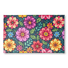 A vibrant, seamless pattern of stylized flowers in a folk art style. Bold, colorful blossoms in shades of pink, orange, and purple pop against a dark navy background, intertwined with green leaves to create a dense and cheerful composition.