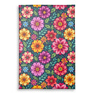 A vibrant, seamless pattern of stylized flowers in a folk art style. Bold, colorful blossoms in shades of pink, orange, and purple pop against a dark navy background, intertwined with green leaves to create a dense and cheerful composition.