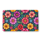 A vibrant, seamless pattern of stylized flowers in a folk art style. Bold, colorful blossoms in shades of pink, orange, and purple pop against a dark navy background, intertwined with green leaves to create a dense and cheerful composition.