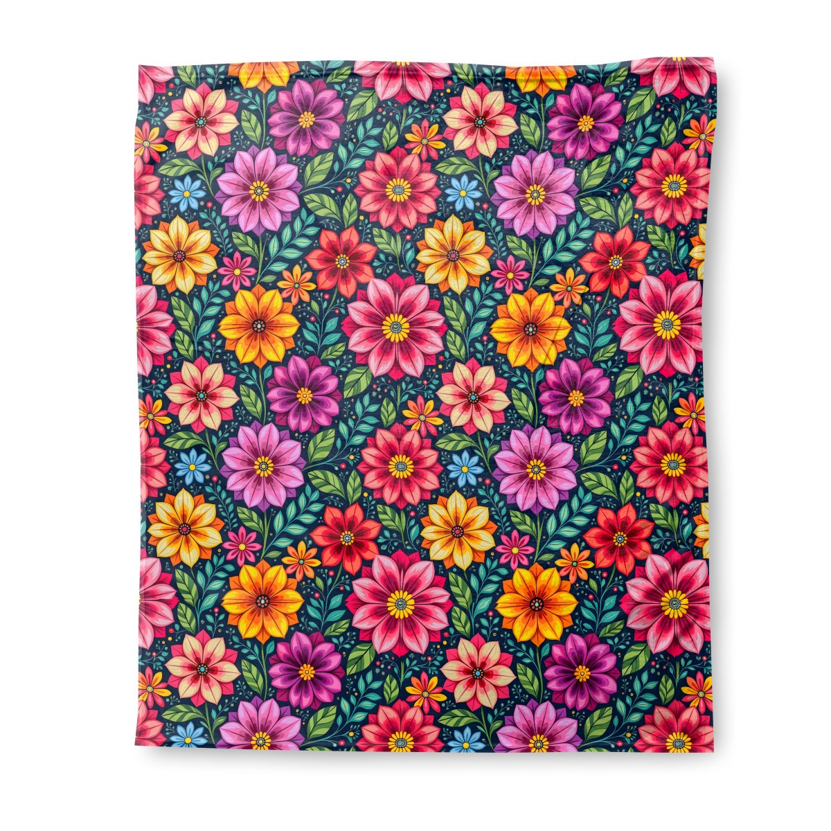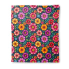 A vibrant, seamless pattern of stylized flowers in a folk art style. Bold, colorful blossoms in shades of pink, orange, and purple pop against a dark navy background, intertwined with green leaves to create a dense and cheerful composition.