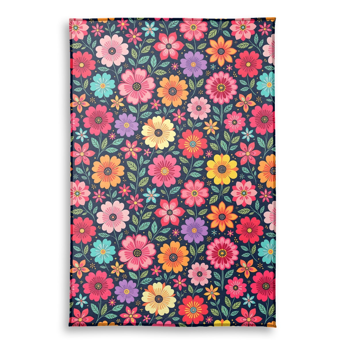 A vibrant, seamless pattern of stylized, colorful flowers in shades of pink, red, orange, and purple. The cheerful blossoms and green leaves pop against a dark navy-blue background, creating a dense and lively folk-art-inspired design.