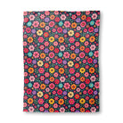 A vibrant, seamless pattern of stylized, colorful flowers in shades of pink, red, orange, and purple. The cheerful blossoms and green leaves pop against a dark navy-blue background, creating a dense and lively folk-art-inspired design.
