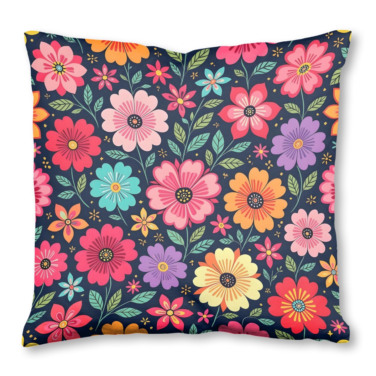A vibrant, seamless pattern of stylized, colorful flowers in shades of pink, red, orange, and purple. The cheerful blossoms and green leaves pop against a dark navy-blue background, creating a dense and lively folk-art-inspired design.