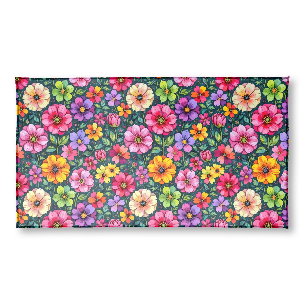 A vibrant, stylized floral pattern featuring a dense arrangement of multicolored flowers. Bright pinks, purples, oranges, and yellows pop against a dark teal background, creating a cheerful and energetic composition.
