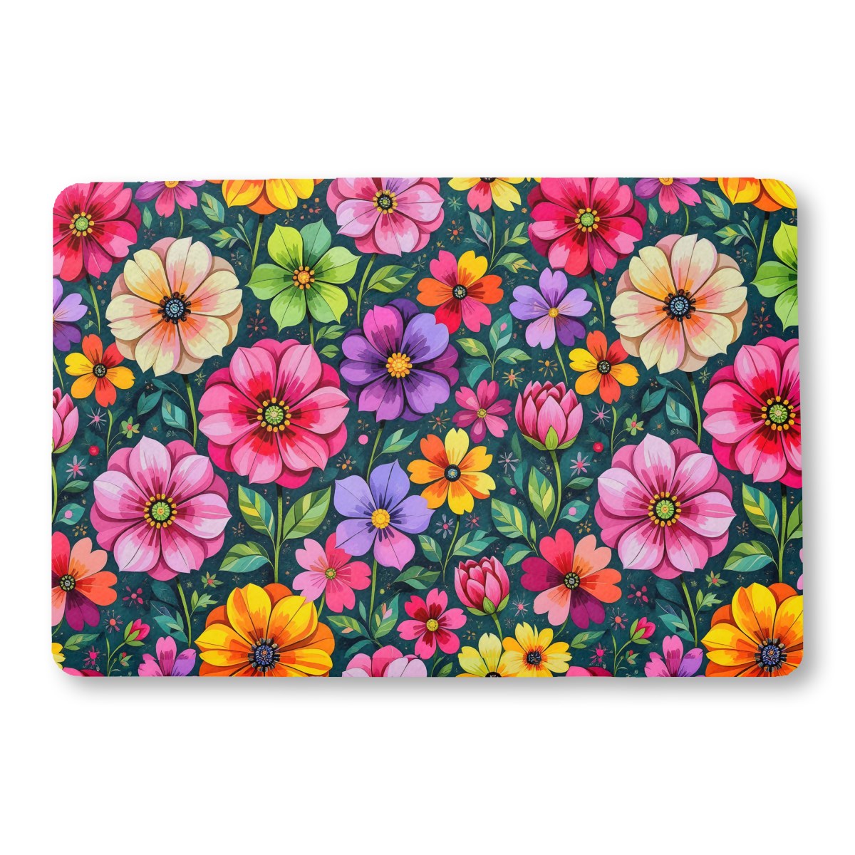 A vibrant, stylized floral pattern featuring a dense arrangement of multicolored flowers. Bright pinks, purples, oranges, and yellows pop against a dark teal background, creating a cheerful and energetic composition.