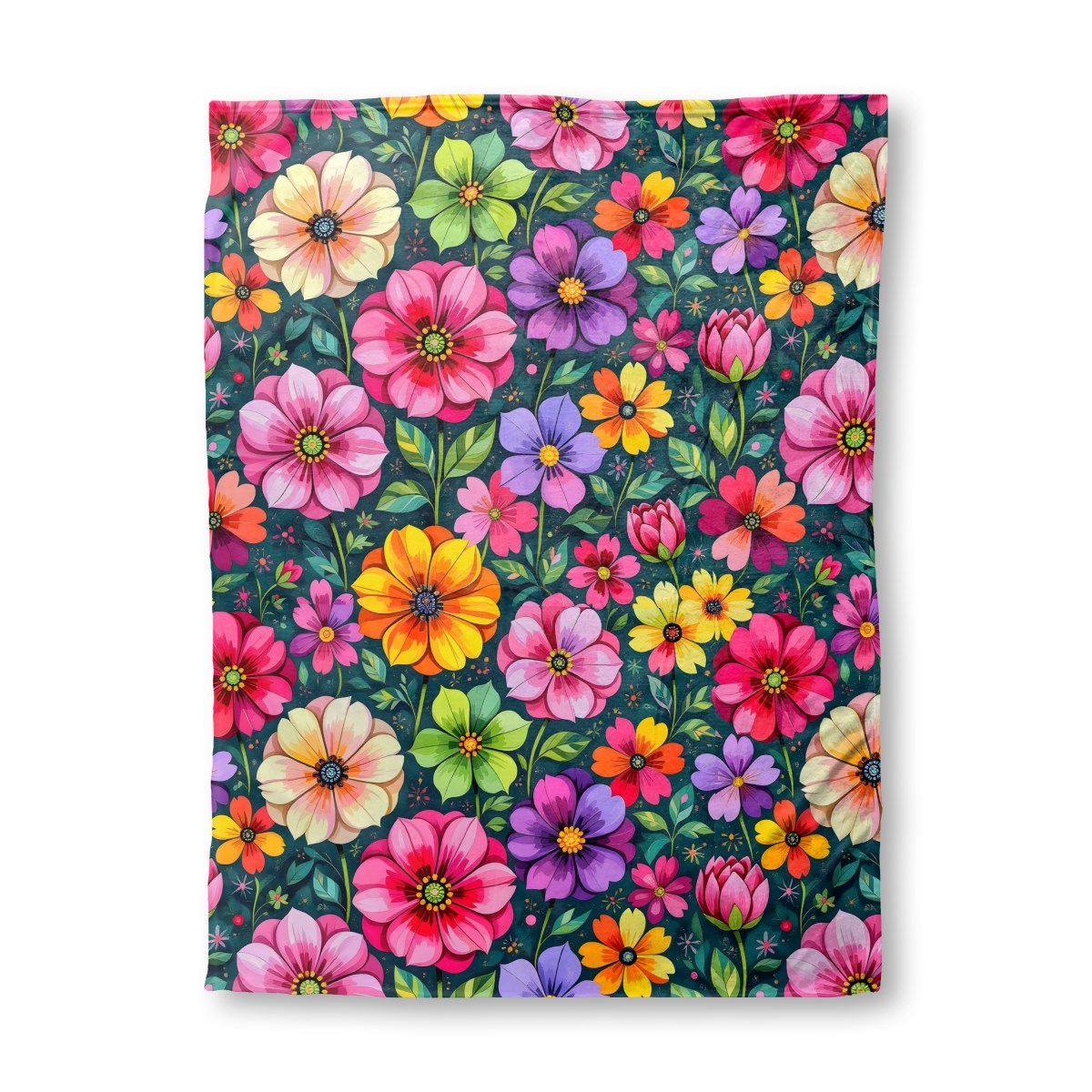 A vibrant, stylized floral pattern featuring a dense arrangement of multicolored flowers. Bright pinks, purples, oranges, and yellows pop against a dark teal background, creating a cheerful and energetic composition.