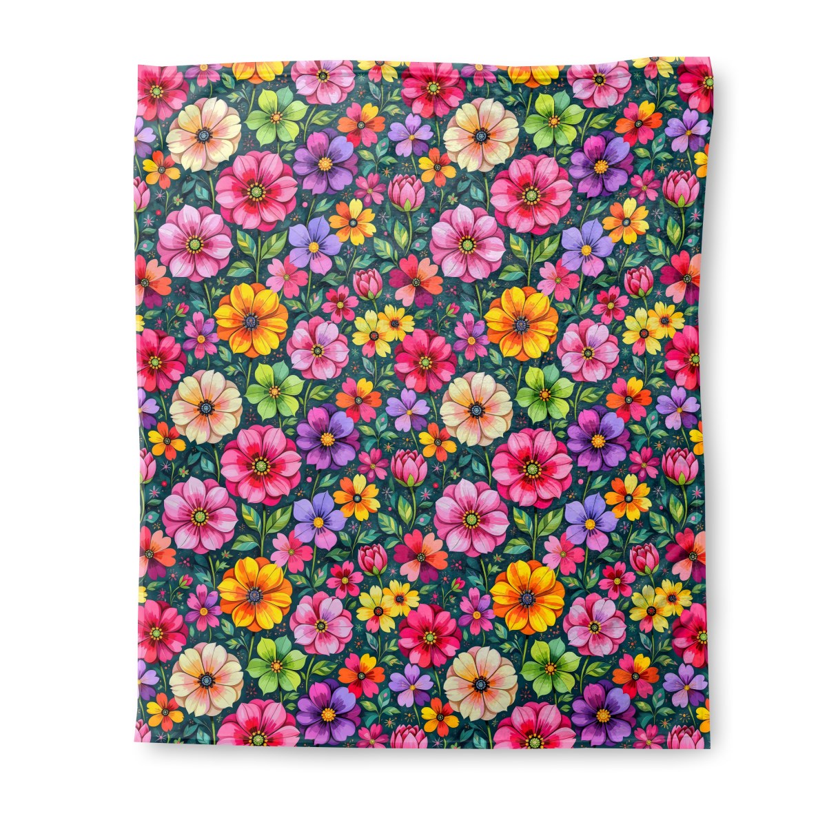 A vibrant, stylized floral pattern featuring a dense arrangement of multicolored flowers. Bright pinks, purples, oranges, and yellows pop against a dark teal background, creating a cheerful and energetic composition.