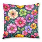 A vibrant, stylized floral pattern featuring a dense arrangement of multicolored flowers. Bright pinks, purples, oranges, and yellows pop against a dark teal background, creating a cheerful and energetic composition.