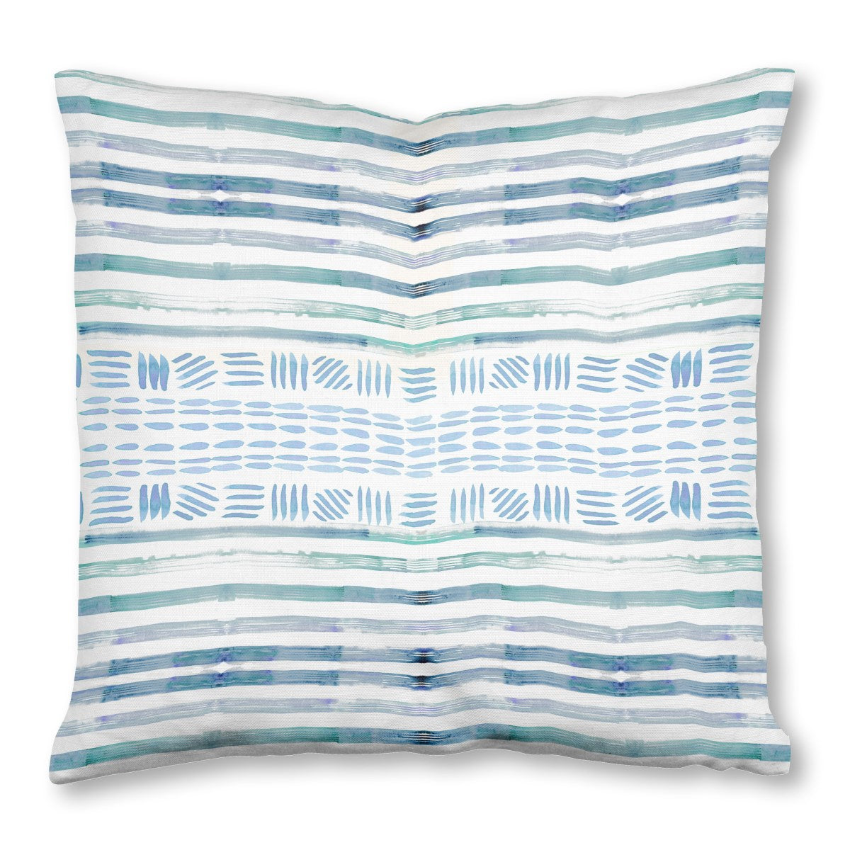 The image is a watercolor painting featuring a repeating pattern. The main design consists of broad horizontal stripes in varying shades of blue and teal, interspersed with thinner stripes of white. A central band displays a more intricate pattern of smaller, stylized shapes, including dashes, dots and small oblong forms, also in varying shades of blue. The overall effect is a harmonious blend of simple stripes and a more textured, almost tribal-inspired pattern. The color palette is cool and calming, emphasizing shades of blue and teal against a white background. The pattern is symmetrical, reflecting across both the horizontal and vertical axes.