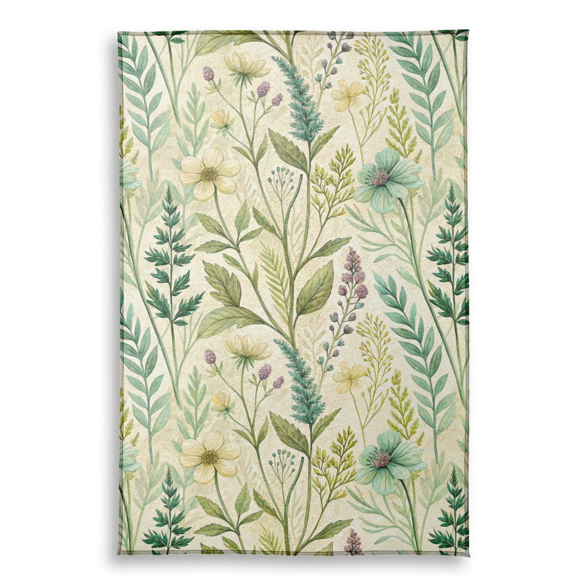 A vintage-style botanical pattern rendered in delicate watercolor. The illustration features a dense arrangement of various wildflowers, herbs, and assorted green foliage on a textured, parchment-like background, creating a soft, naturalistic design with an antique feel.