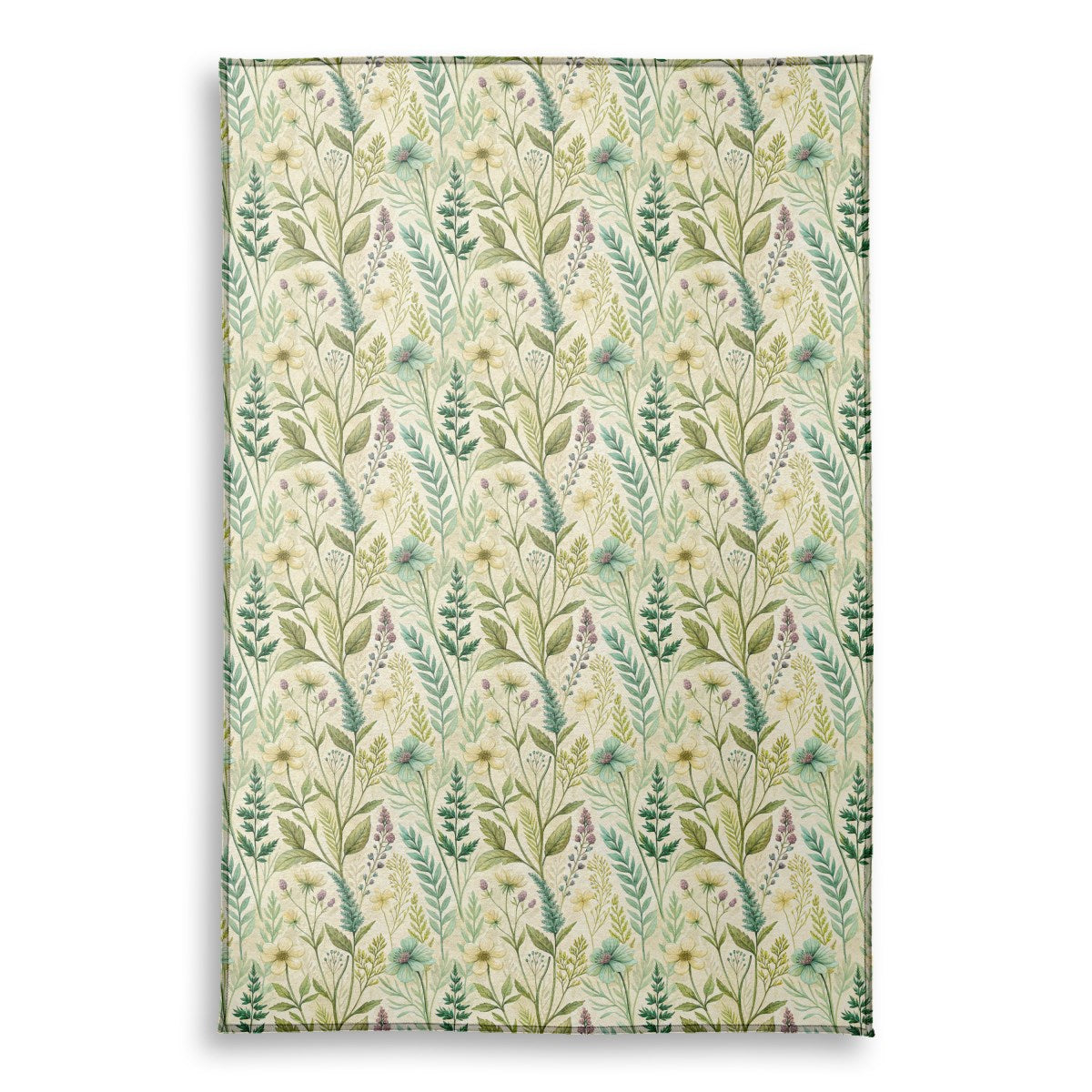 A vintage-style botanical pattern rendered in delicate watercolor. The illustration features a dense arrangement of various wildflowers, herbs, and assorted green foliage on a textured, parchment-like background, creating a soft, naturalistic design with an antique feel.