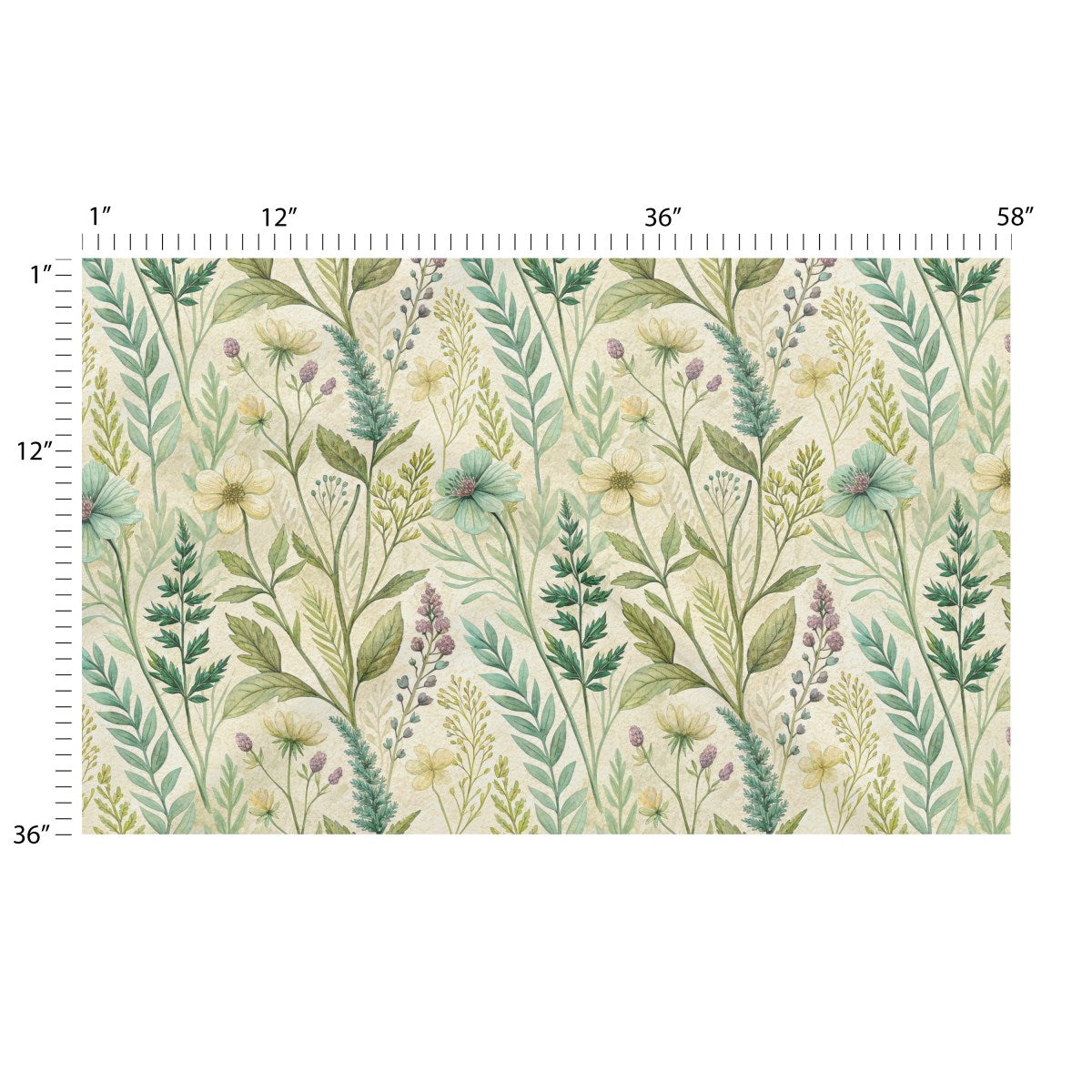 A vintage-style botanical pattern rendered in delicate watercolor. The illustration features a dense arrangement of various wildflowers, herbs, and assorted green foliage on a textured, parchment-like background, creating a soft, naturalistic design with an antique feel.