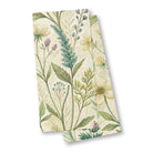 A vintage-style botanical pattern rendered in delicate watercolor. The illustration features a dense arrangement of various wildflowers, herbs, and assorted green foliage on a textured, parchment-like background, creating a soft, naturalistic design with an antique feel.