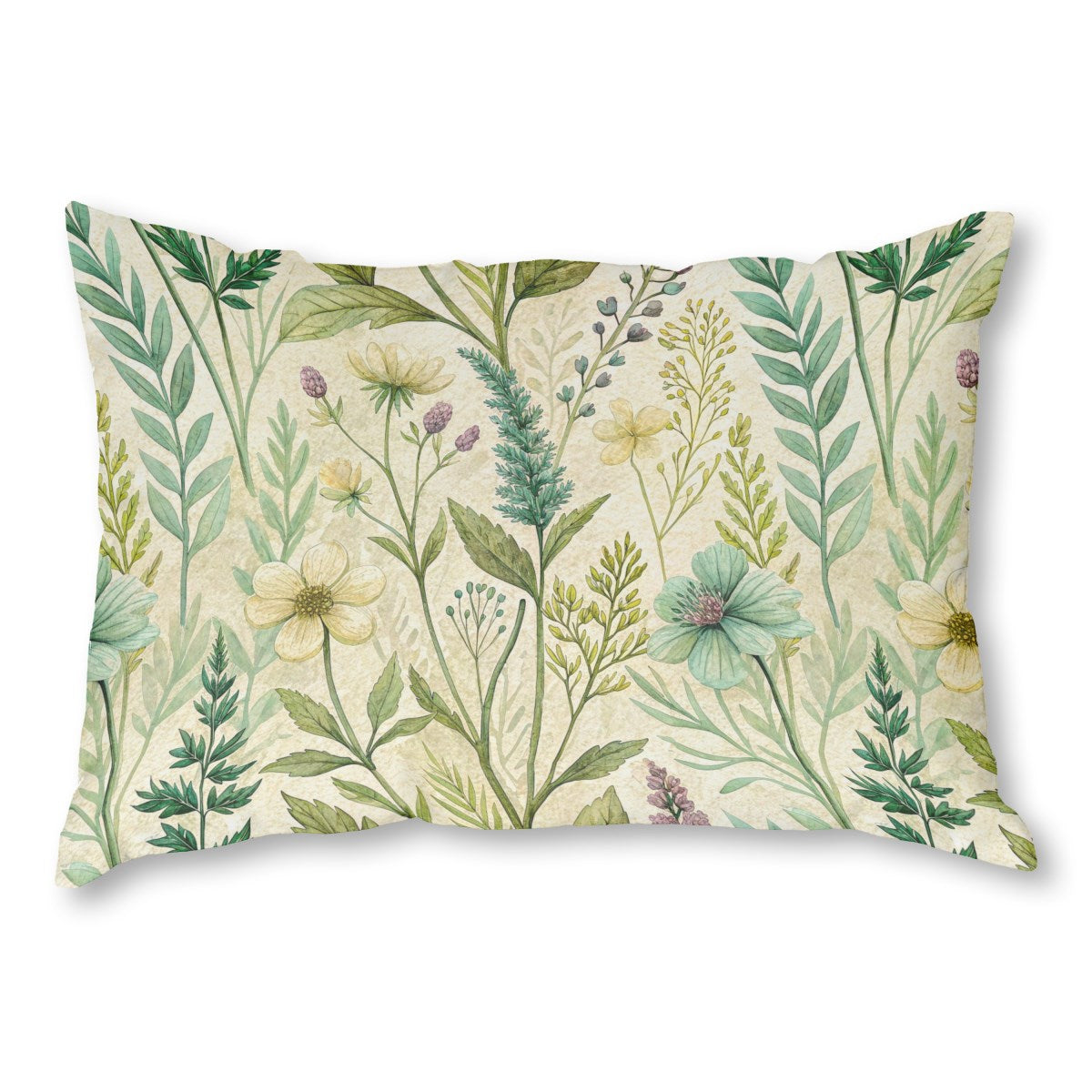 A vintage-style botanical pattern rendered in delicate watercolor. The illustration features a dense arrangement of various wildflowers, herbs, and assorted green foliage on a textured, parchment-like background, creating a soft, naturalistic design with an antique feel.