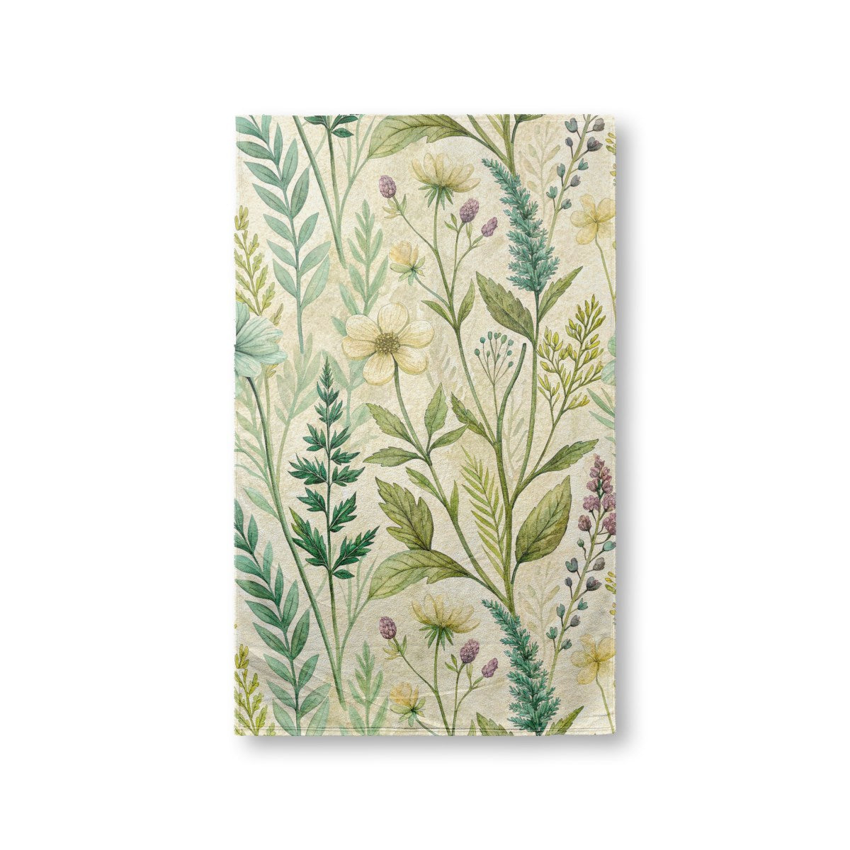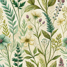 A vintage-style botanical pattern rendered in delicate watercolor. The illustration features a dense arrangement of various wildflowers, herbs, and assorted green foliage on a textured, parchment-like background, creating a soft, naturalistic design with an antique feel.