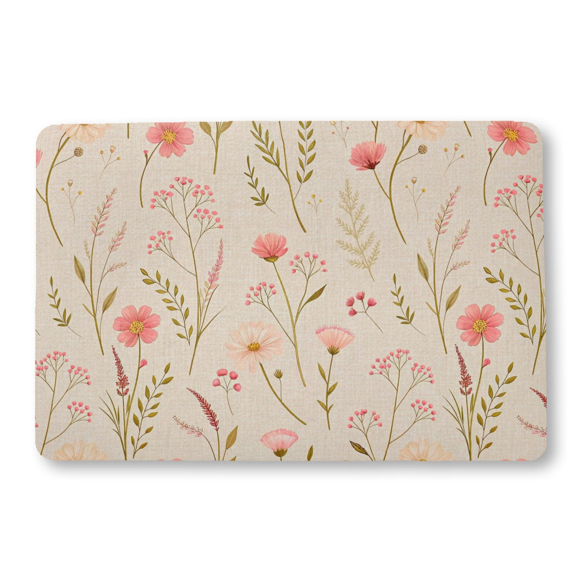 A seamless botanical pattern featuring delicate wildflowers. Pink and cream blossoms with slender green stems are scattered across a light, textured beige background, creating a soft and vintage feel.