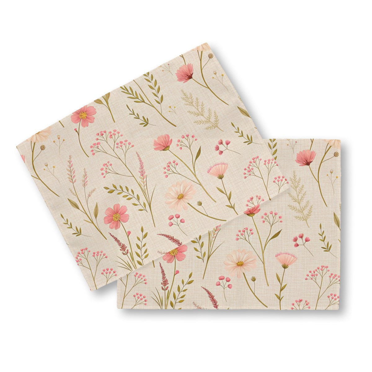 A seamless botanical pattern featuring delicate wildflowers. Pink and cream blossoms with slender green stems are scattered across a light, textured beige background, creating a soft and vintage feel.