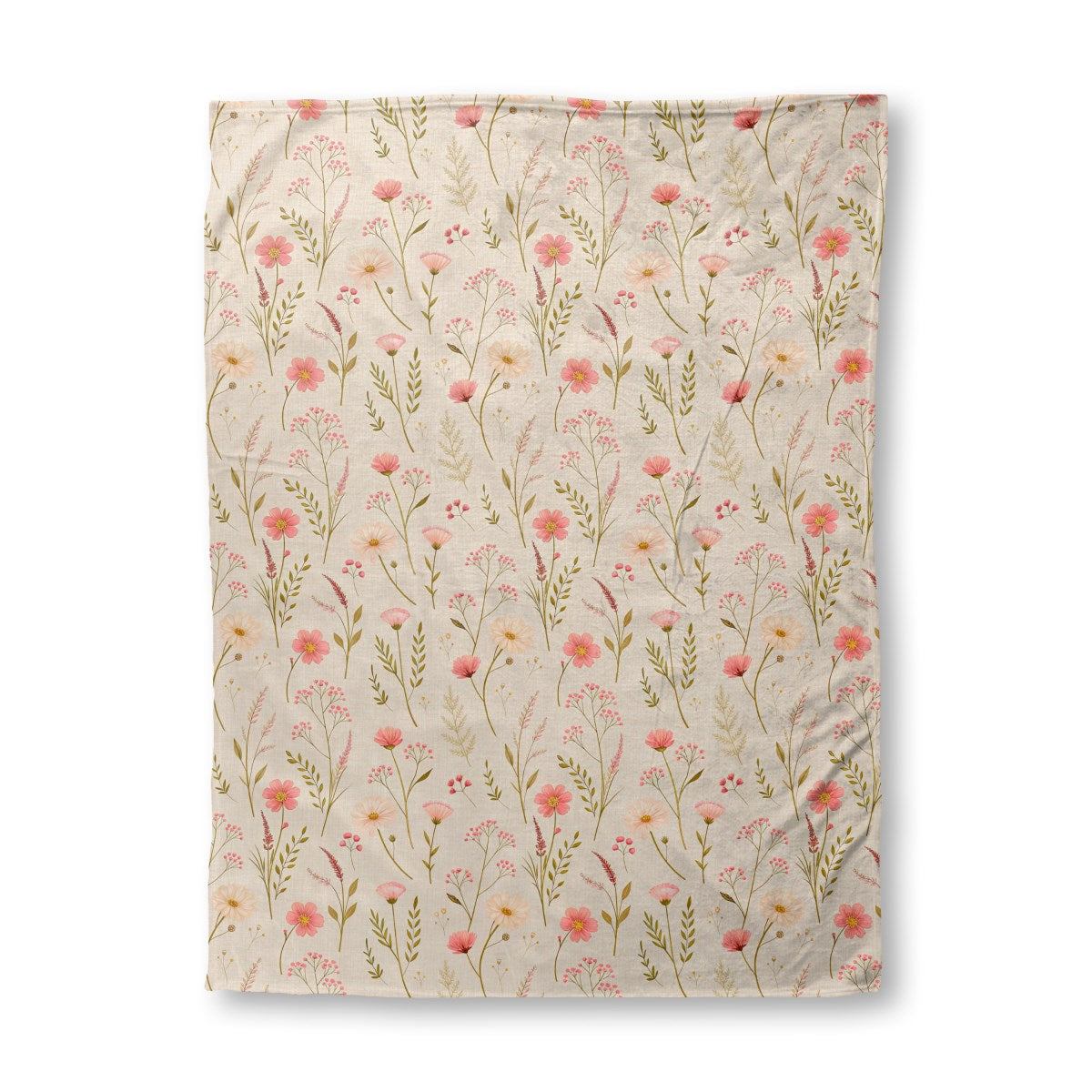 A seamless botanical pattern featuring delicate wildflowers. Pink and cream blossoms with slender green stems are scattered across a light, textured beige background, creating a soft and vintage feel.