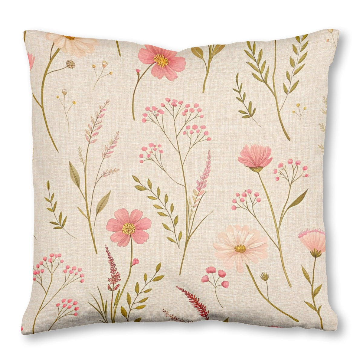 A seamless botanical pattern featuring delicate wildflowers. Pink and cream blossoms with slender green stems are scattered across a light, textured beige background, creating a soft and vintage feel.