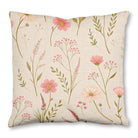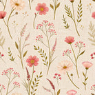 A seamless botanical pattern featuring delicate wildflowers. Pink and cream blossoms with slender green stems are scattered across a light, textured beige background, creating a soft and vintage feel.