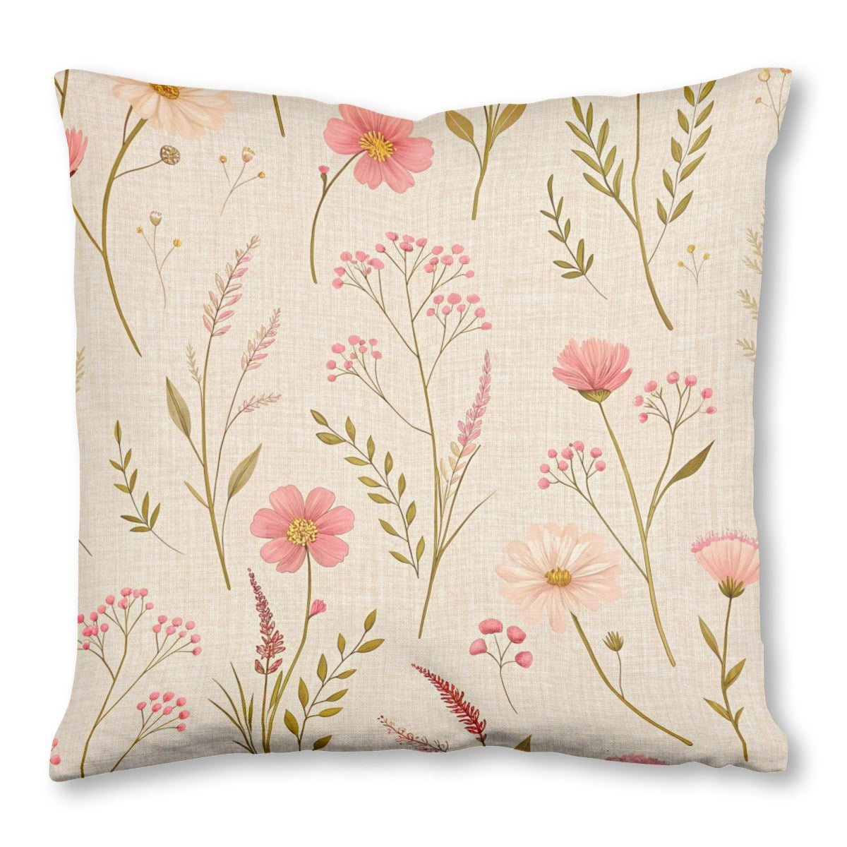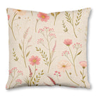 A seamless botanical pattern featuring delicate wildflowers. Pink and cream blossoms with slender green stems are scattered across a light, textured beige background, creating a soft and vintage feel.
