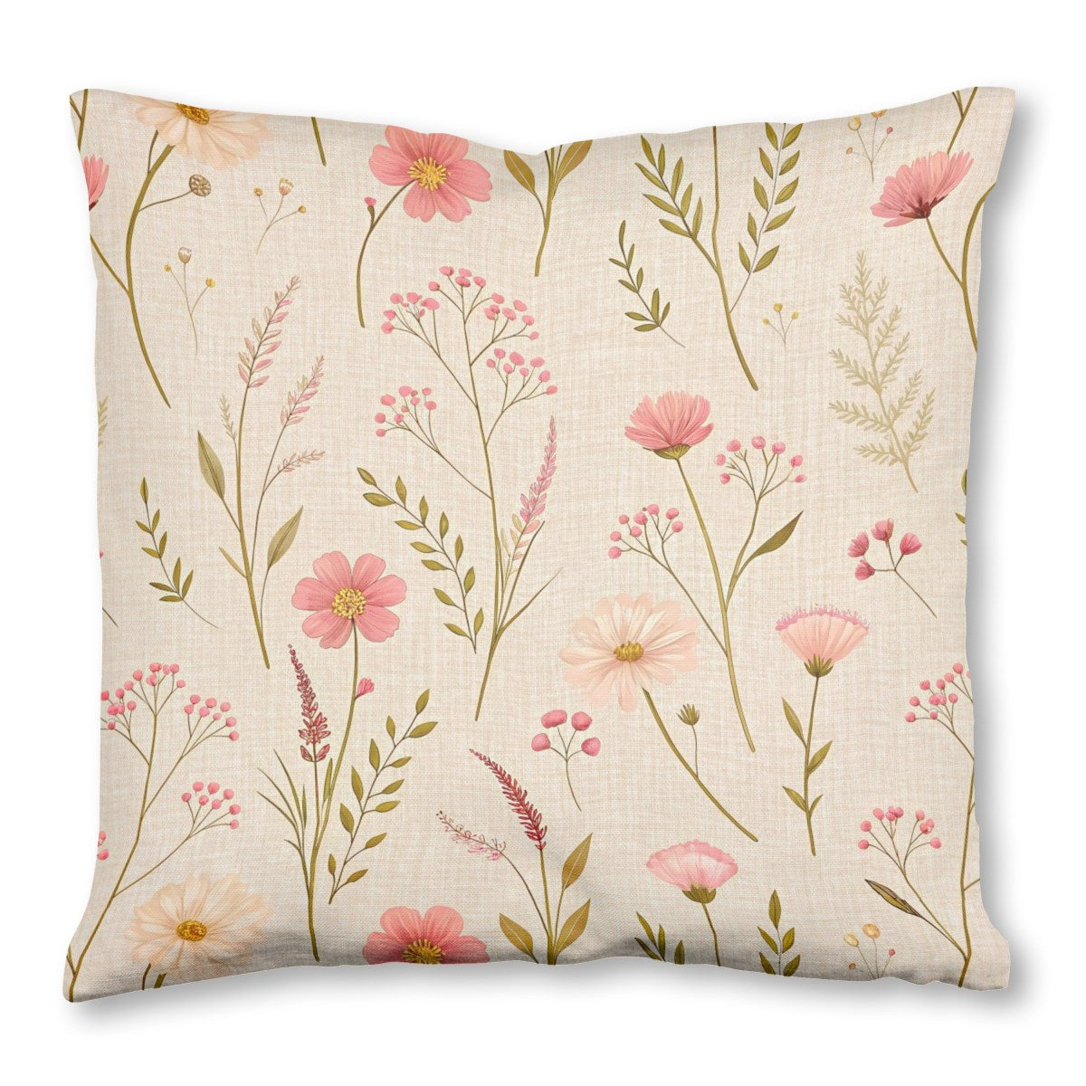 A seamless botanical pattern featuring delicate wildflowers. Pink and cream blossoms with slender green stems are scattered across a light, textured beige background, creating a soft and vintage feel.