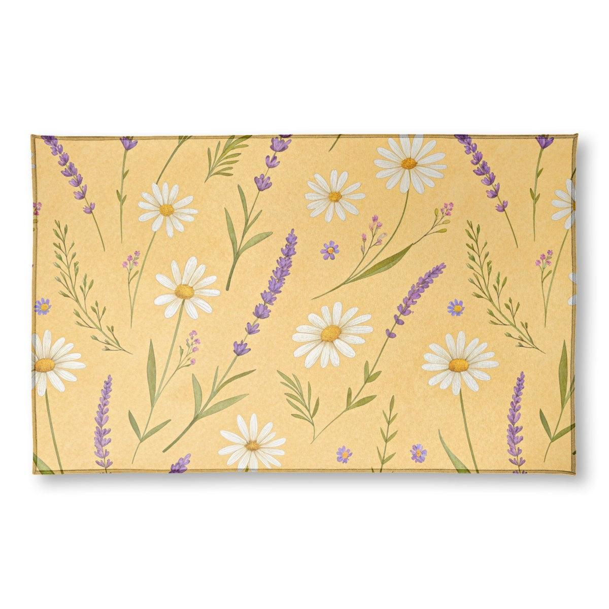 A seamless floral pattern in a watercolor style, featuring white daisies and purple lavender sprigs scattered across a warm, textured yellow background. The design creates a gentle and charming botanical feel.