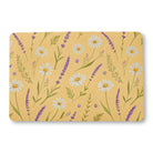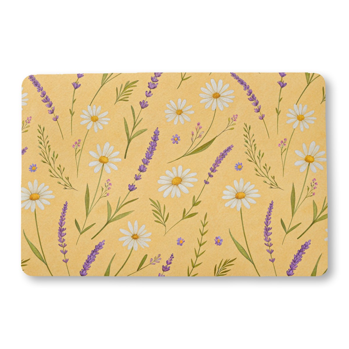 A seamless floral pattern in a watercolor style, featuring white daisies and purple lavender sprigs scattered across a warm, textured yellow background. The design creates a gentle and charming botanical feel.