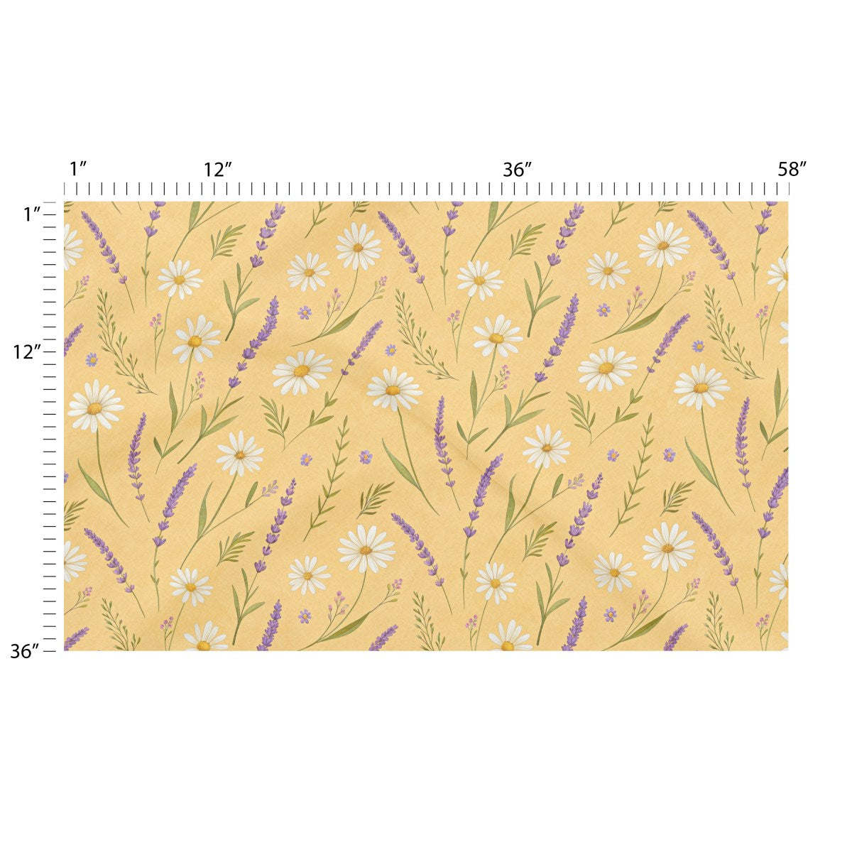 A seamless floral pattern in a watercolor style, featuring white daisies and purple lavender sprigs scattered across a warm, textured yellow background. The design creates a gentle and charming botanical feel.