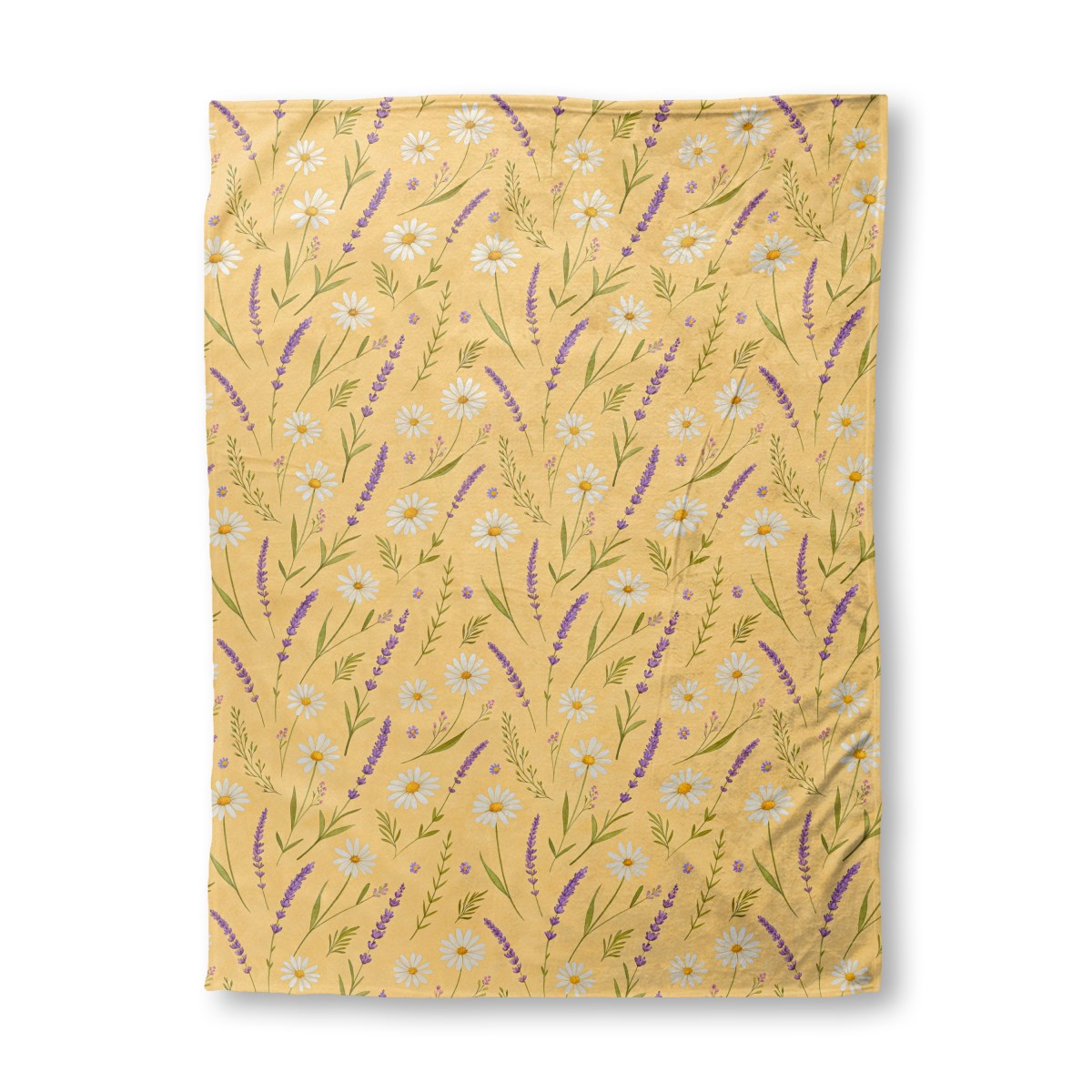 A seamless floral pattern in a watercolor style, featuring white daisies and purple lavender sprigs scattered across a warm, textured yellow background. The design creates a gentle and charming botanical feel.